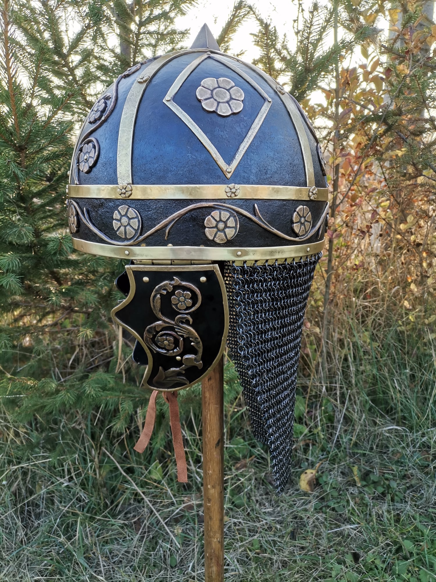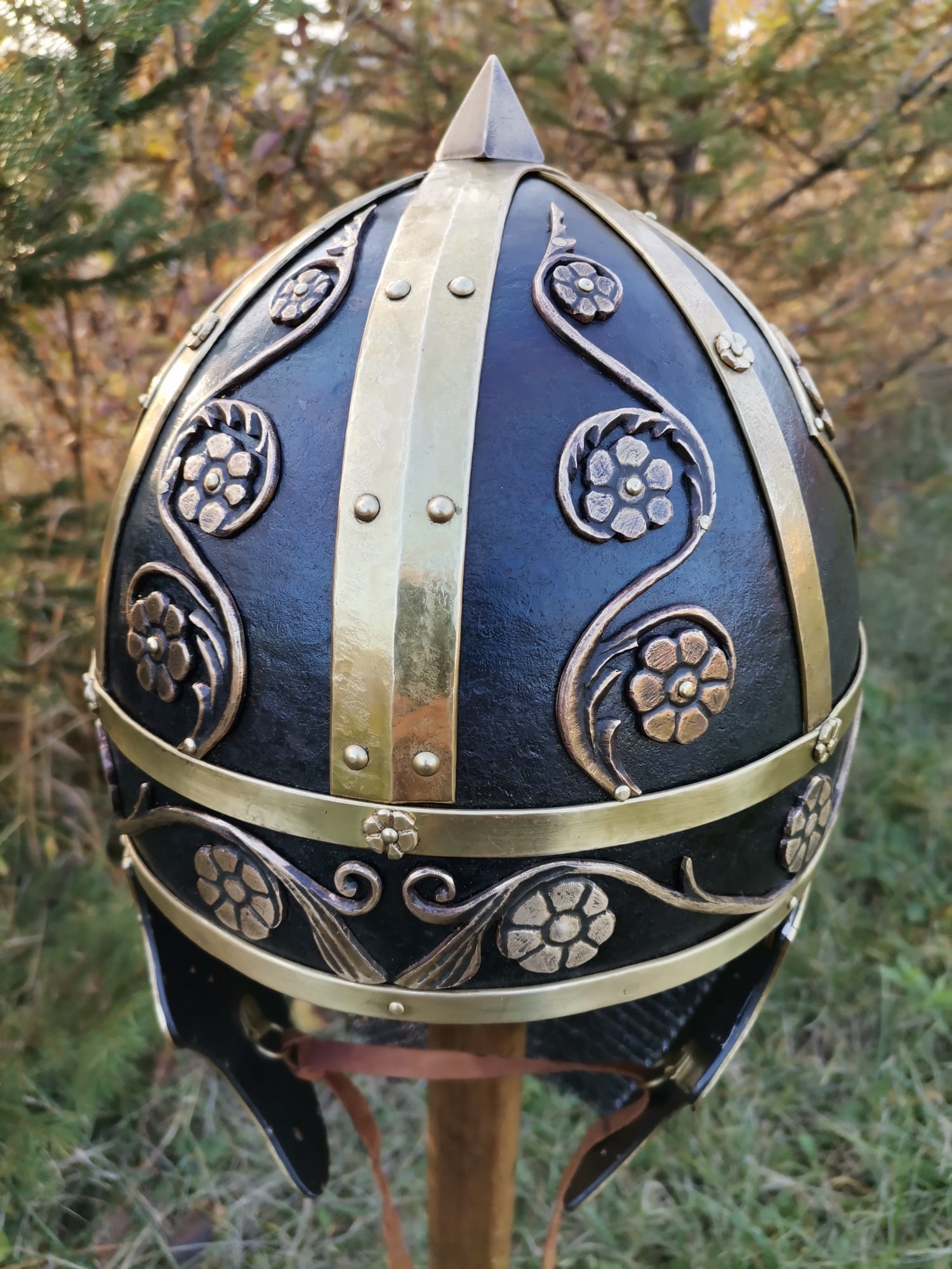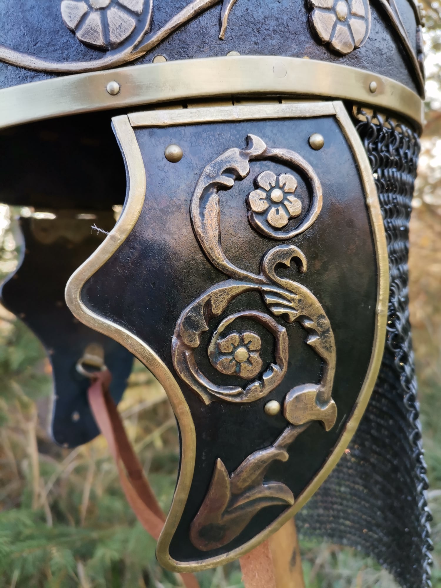 Modelul ales este bogat ornamentat, în cea mai mare parte cu motive florale. Am încercat să fiu cât mai apropiat de original, doar în cazul obrăzarelor am ales un tip de decorațiune de la alt coif, obrăzarele lipsind la primul.